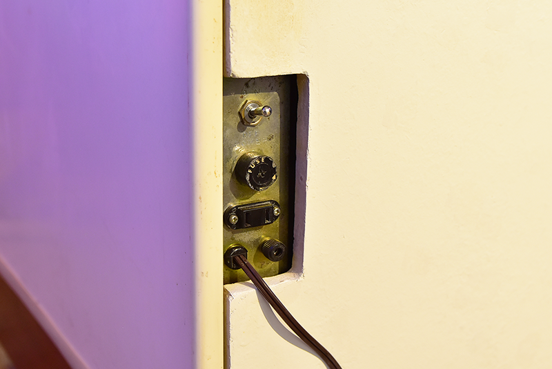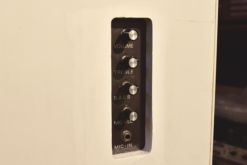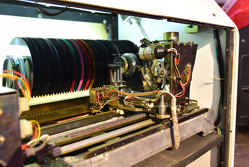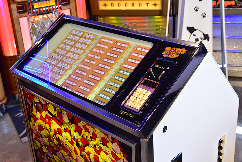 高さ108cmとコンパクトなボディでリビング等にもすっきりと収まるサイズで、50枚のEPレコードを収容して最大100曲の音楽を演奏する事が出来ます。また、シンプルなミュージックパネルにはテンキーボタンで選曲した数字が表示される7セグ液晶画面が備わり、他にも鮮やかな花柄がデザインされたフロントガラスパネルや当時流行したカラオケレコードに対応したマイク(フォン)端子など、1970年代の昭和レトロを感じさせるディテールが詰まっています。