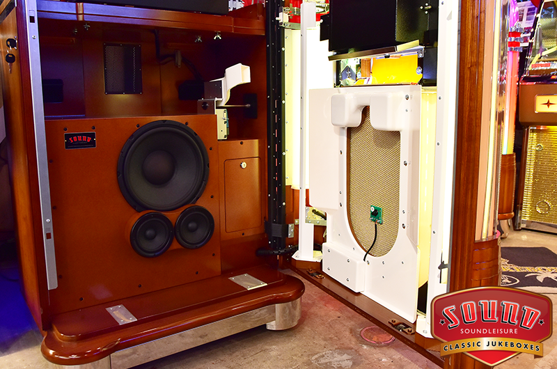 - SOUND LEISURE社オリジナルの「D4デジタルステレオアンプ(60W/Ch)」を搭載し、パワフルでダイナミックな音を再現。さらには、Bluetoothレシーバーを標準装備し、お手元のミュージックプレイヤーやパソコン等に保存した音楽もジュークボックスから演奏させる事が可能です。